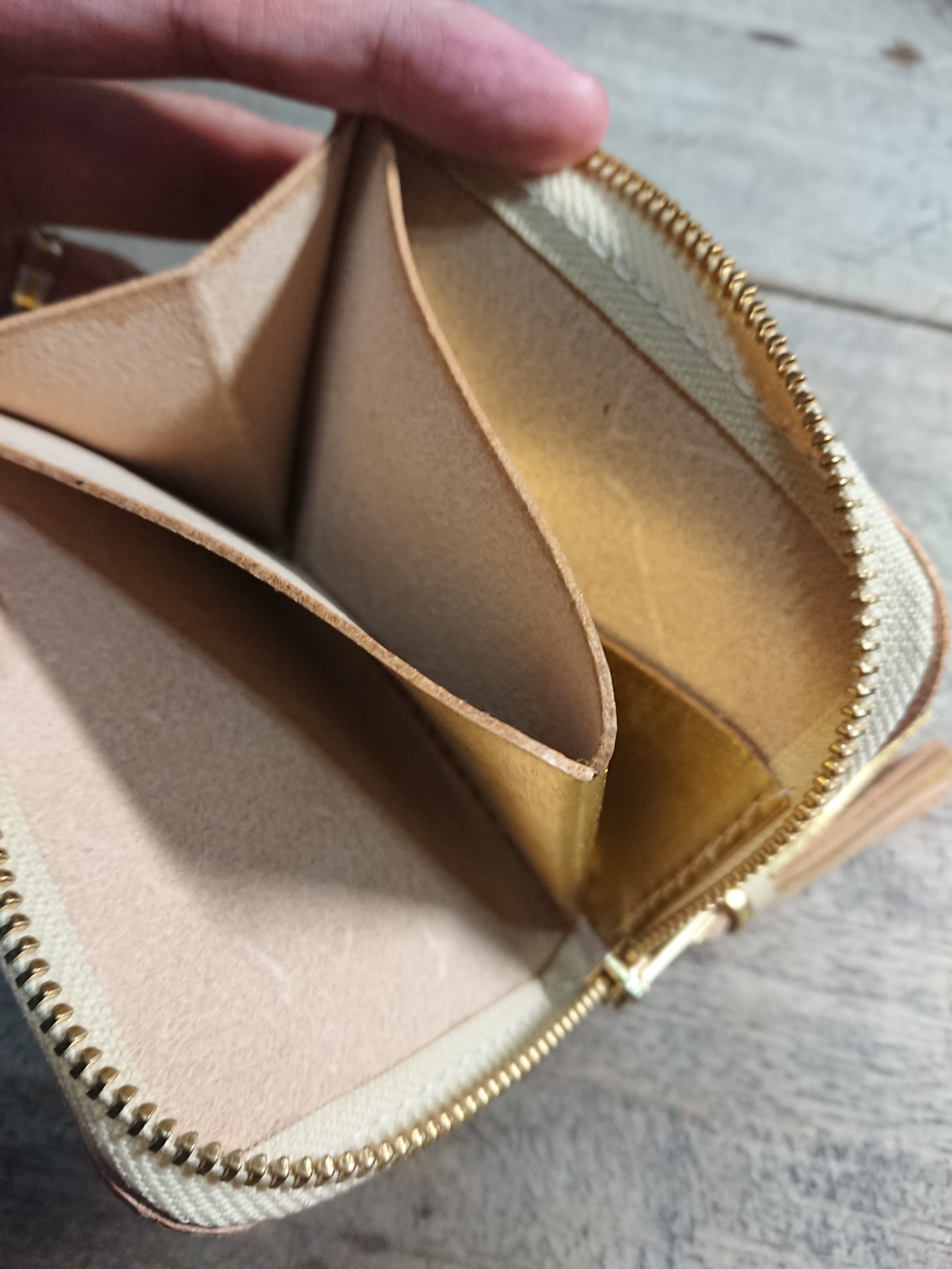 また小銭入れ部分は開いた時に三角形になるようにマチを付けており小銭が格段に取り出しやすくなっております。